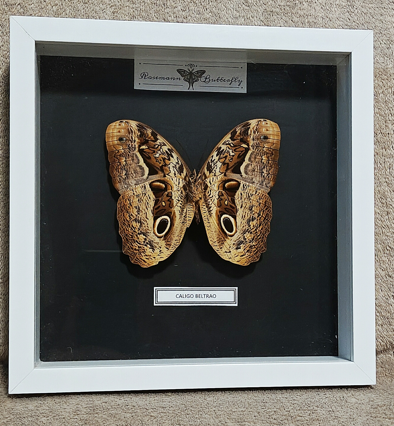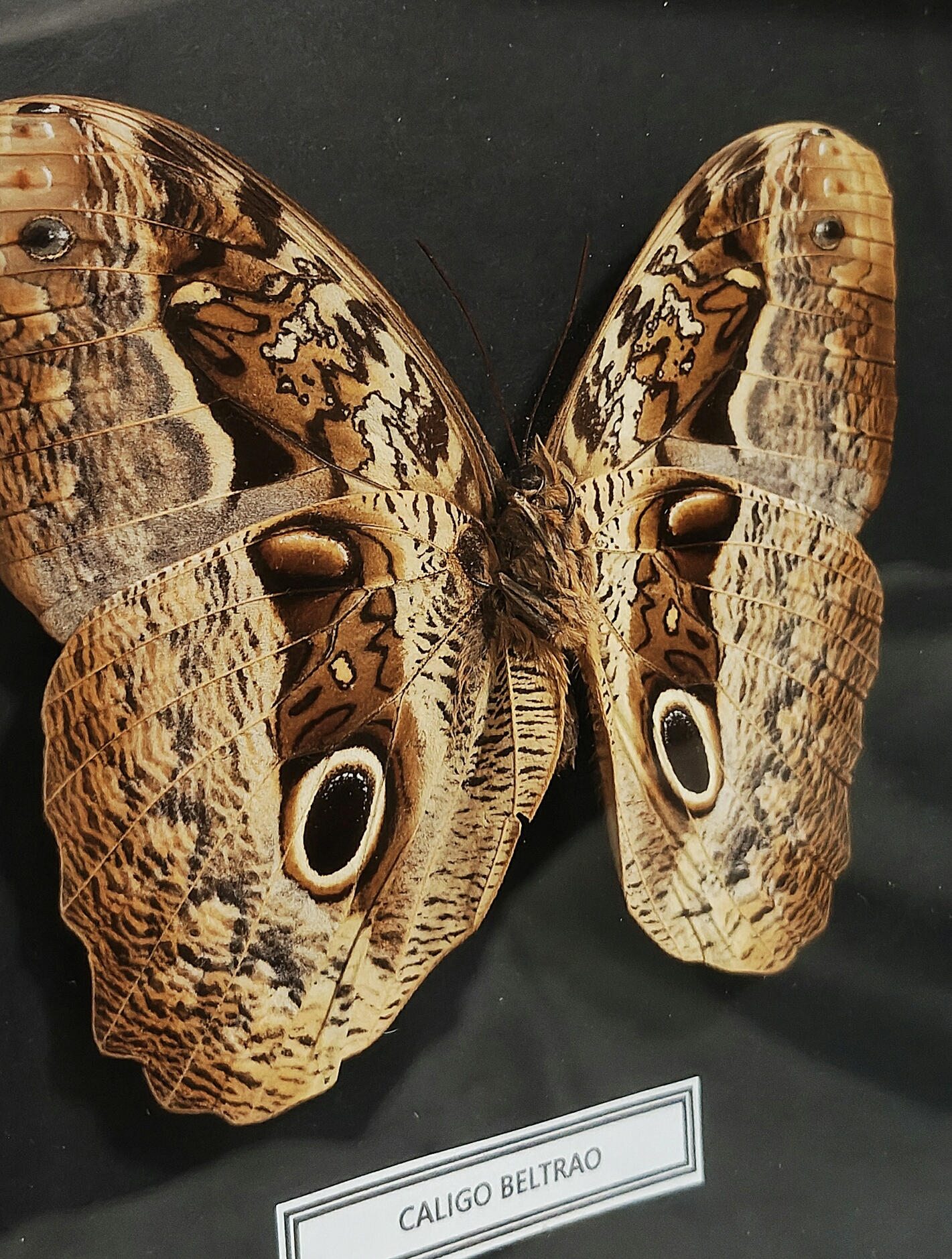 Ez a nagyméretű Caligo beltrao példány jellegzetes, „szemfoltos” mintázatával a Caligo nemzetség egyik legkarakteresebb képviselője. A barnás, márványozott szárnyrajzolat és a hangsúlyos szemfoltok a faj természetes megjelenésének meghatározó elemei.
