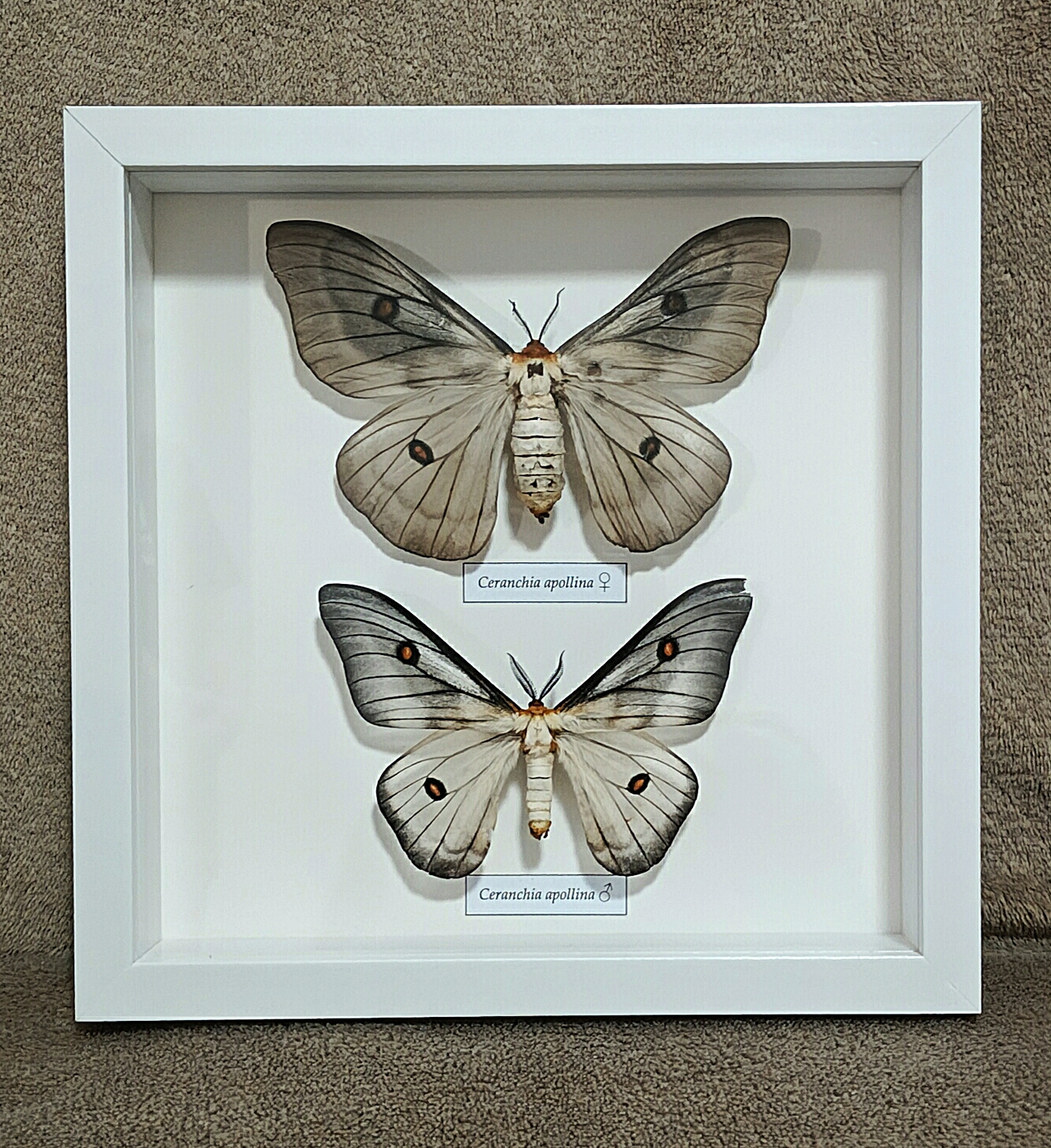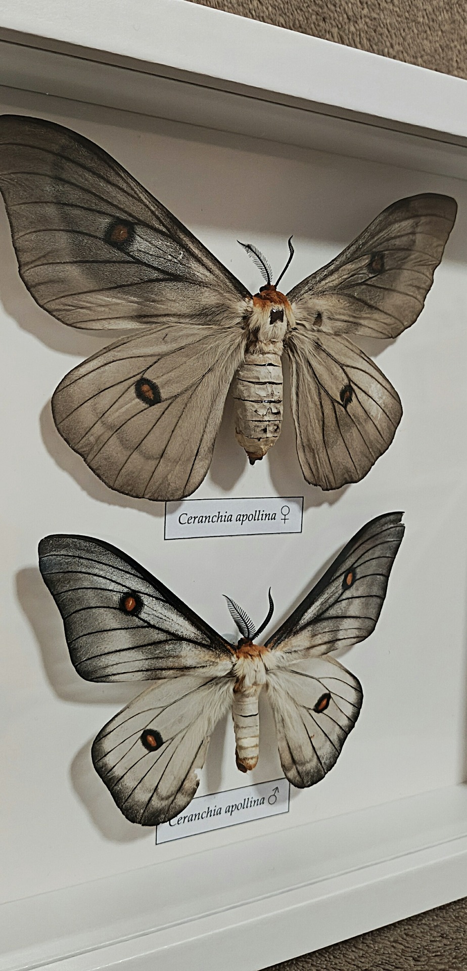 A Ceranchia apollina különleges, elegánsan visszafogott megjelenésű éjjeli lepke, amely finom szürkés-ezüstös tónusaival, áttetsző hatású szárnyaival és jellegzetes narancsos szemfoltjaival rendkívül esztétikus látványt nyújt. A nőstény és a hím egy keretben történő bemutatása ritka és kifejezetten látványos összeállítás, gyönyörűen szemlélteti a fajon belüli méret- és formabeli különbségeket.