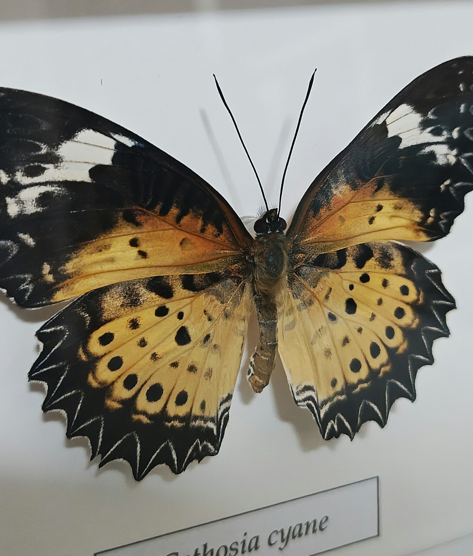 A Cethosia cyane szárnyainak mintázata első pillantásra magára vonja a tekintetet: a világos, krémes alapszínt mély fekete és meleg, barnás árnyalatok törik meg, apró pöttyökkel és határozott mintákkal.