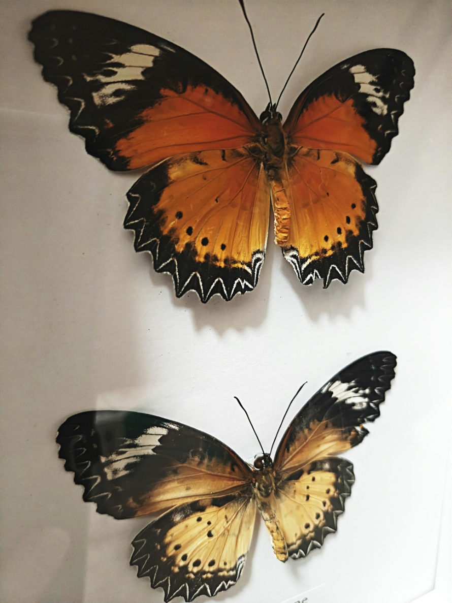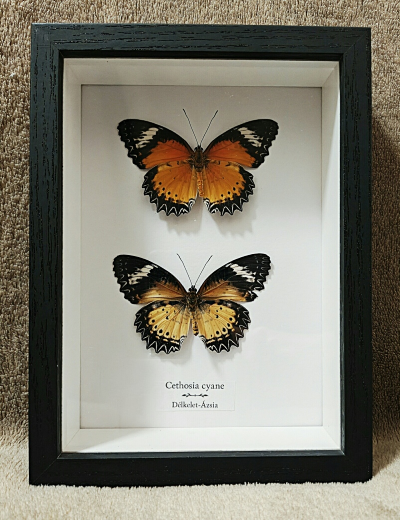 A Cethosia cyane pár látványos színvilága az egyik legszebb trópusi lepkék közé emeli ezt a fajt. A hím és a nőstény egymás mellett különösen harmonikus megjelenést nyújtanak a keretben.