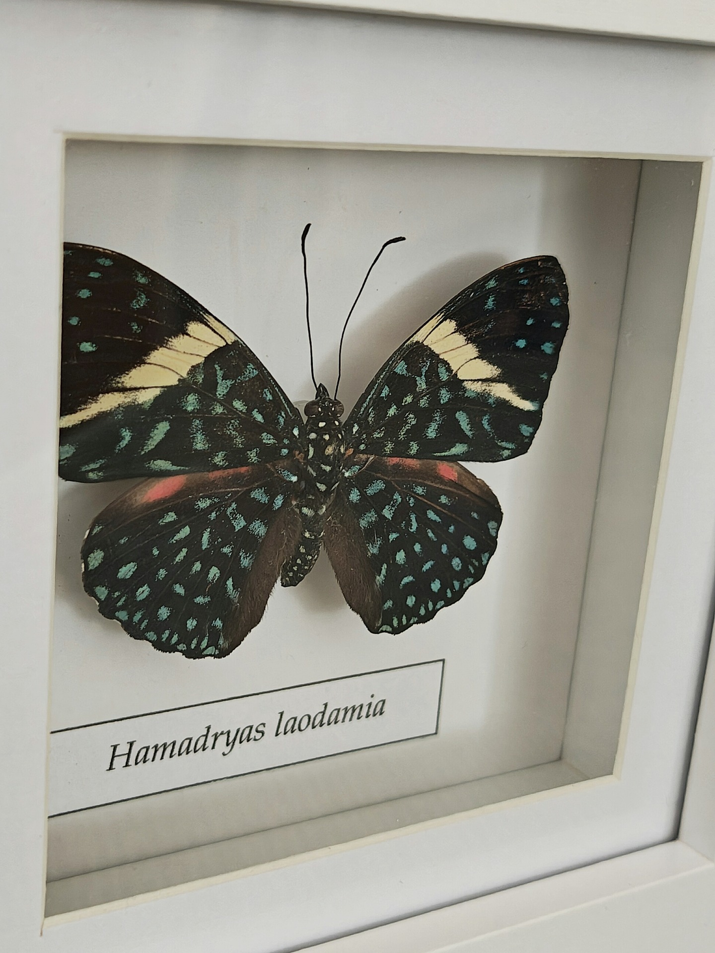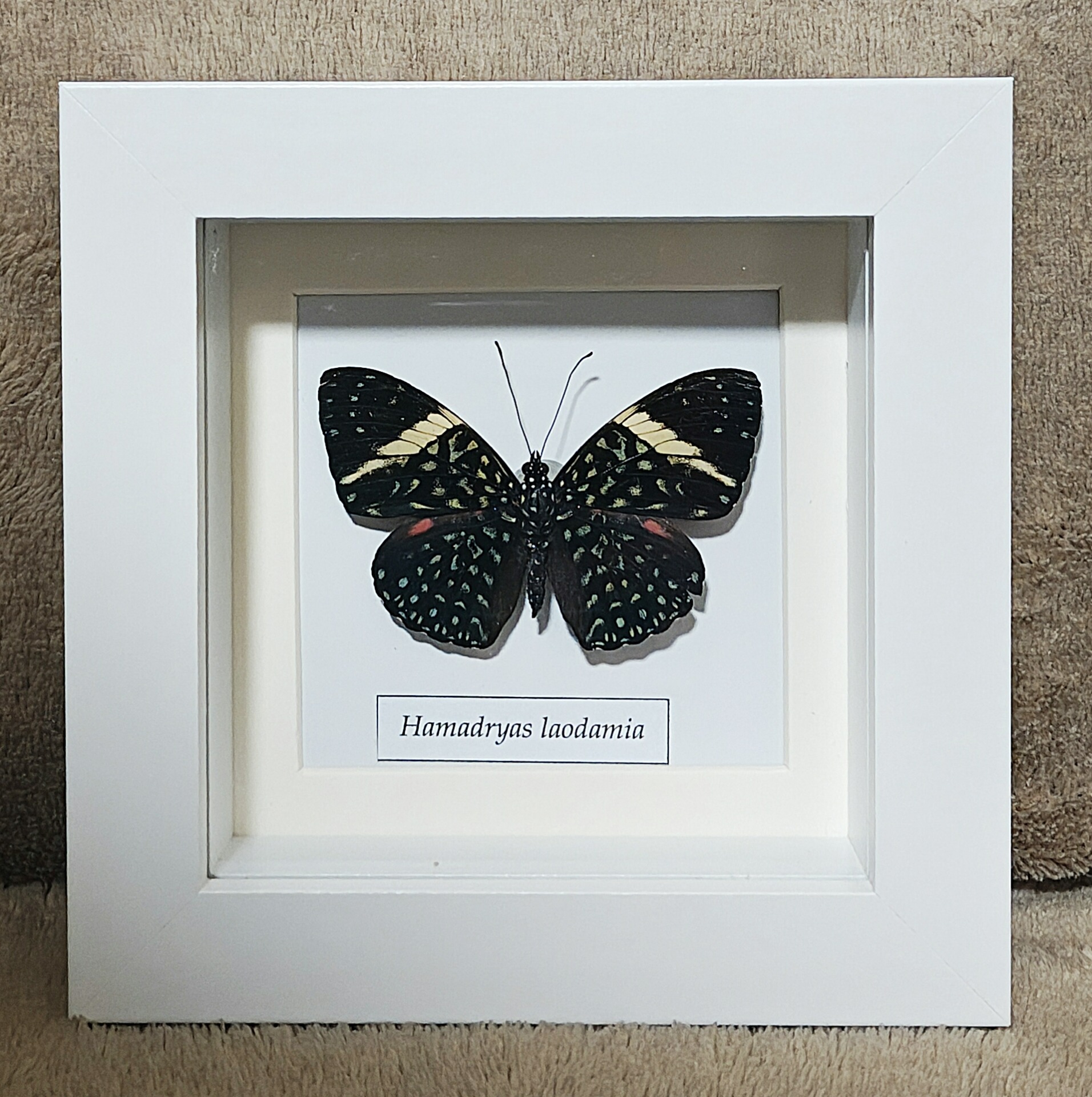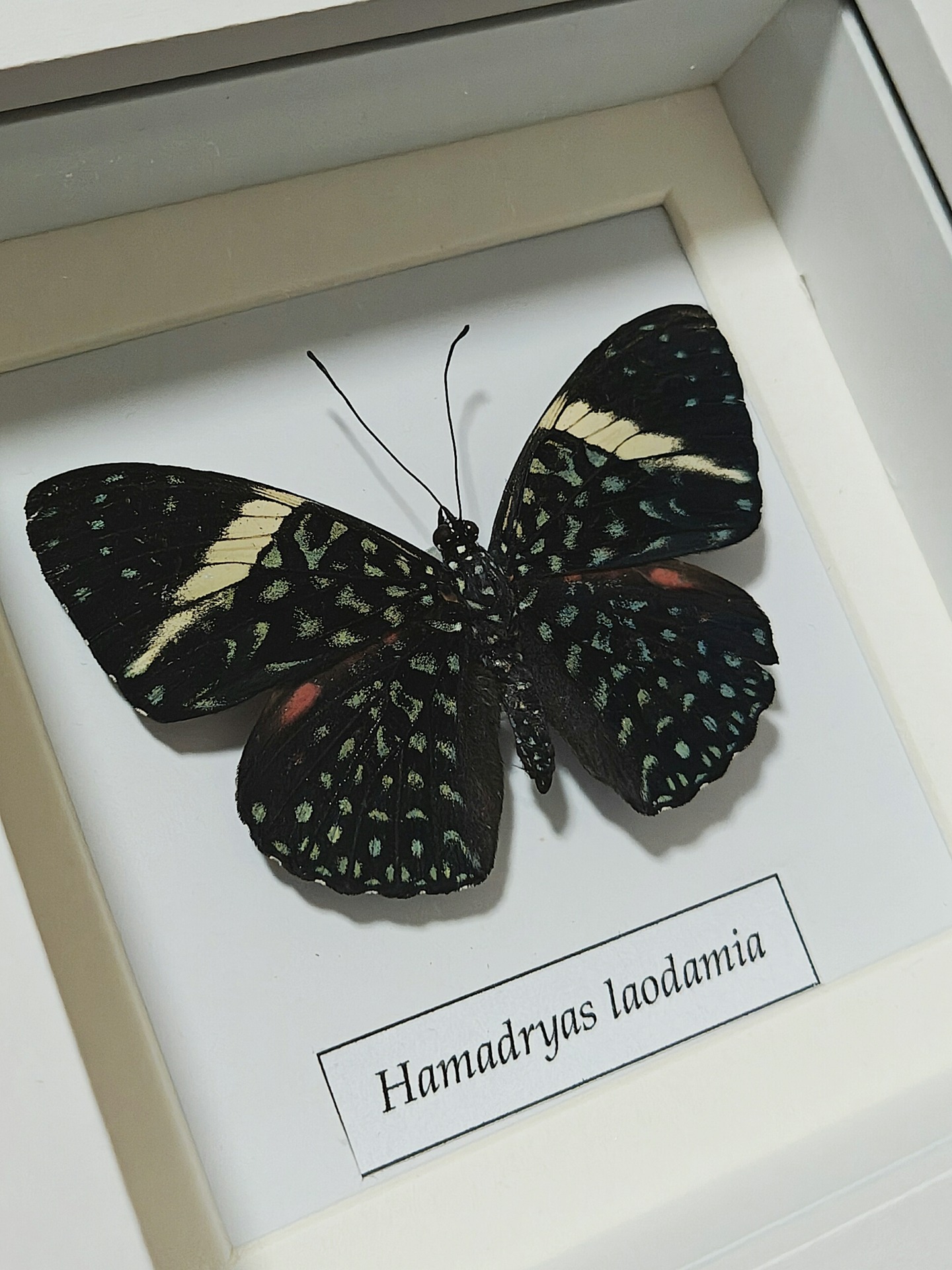 A Hamadryas laodamia szárnyain sötét alapon apró, kék pontok és minták jelennek meg, amelyek a fekete háttéren a csillagos égboltra emlékeztetnek. Ez a finom, részletgazdag mintázat különleges hangulatot ad a lepkének, és közelről nézve is érdekes, változatos látványt nyújt.