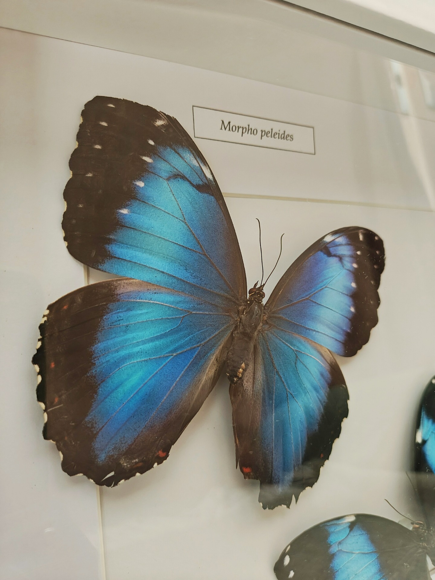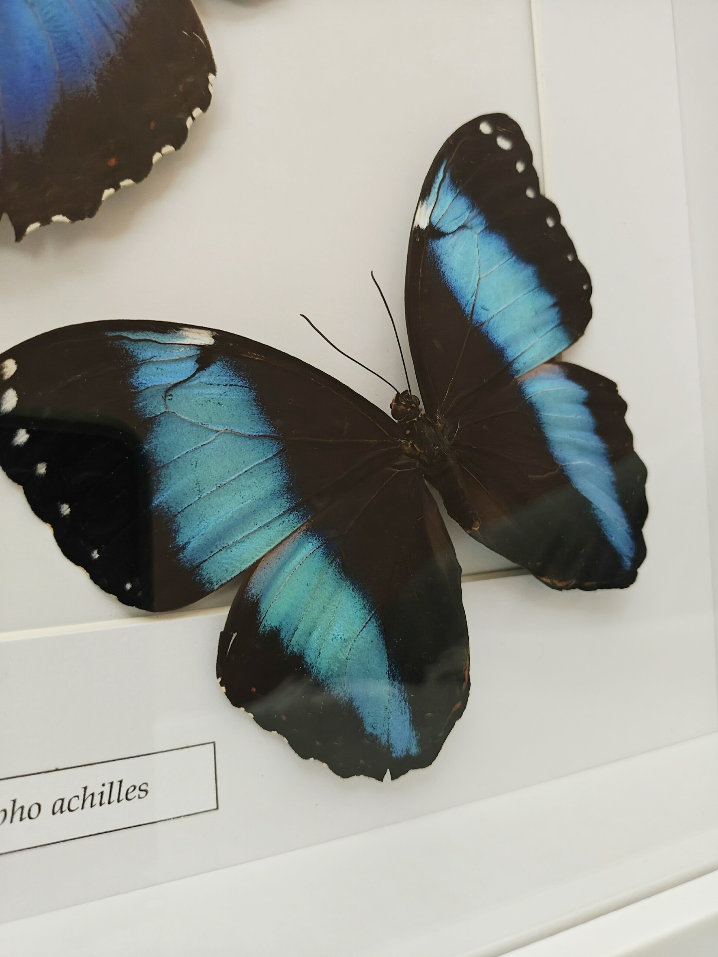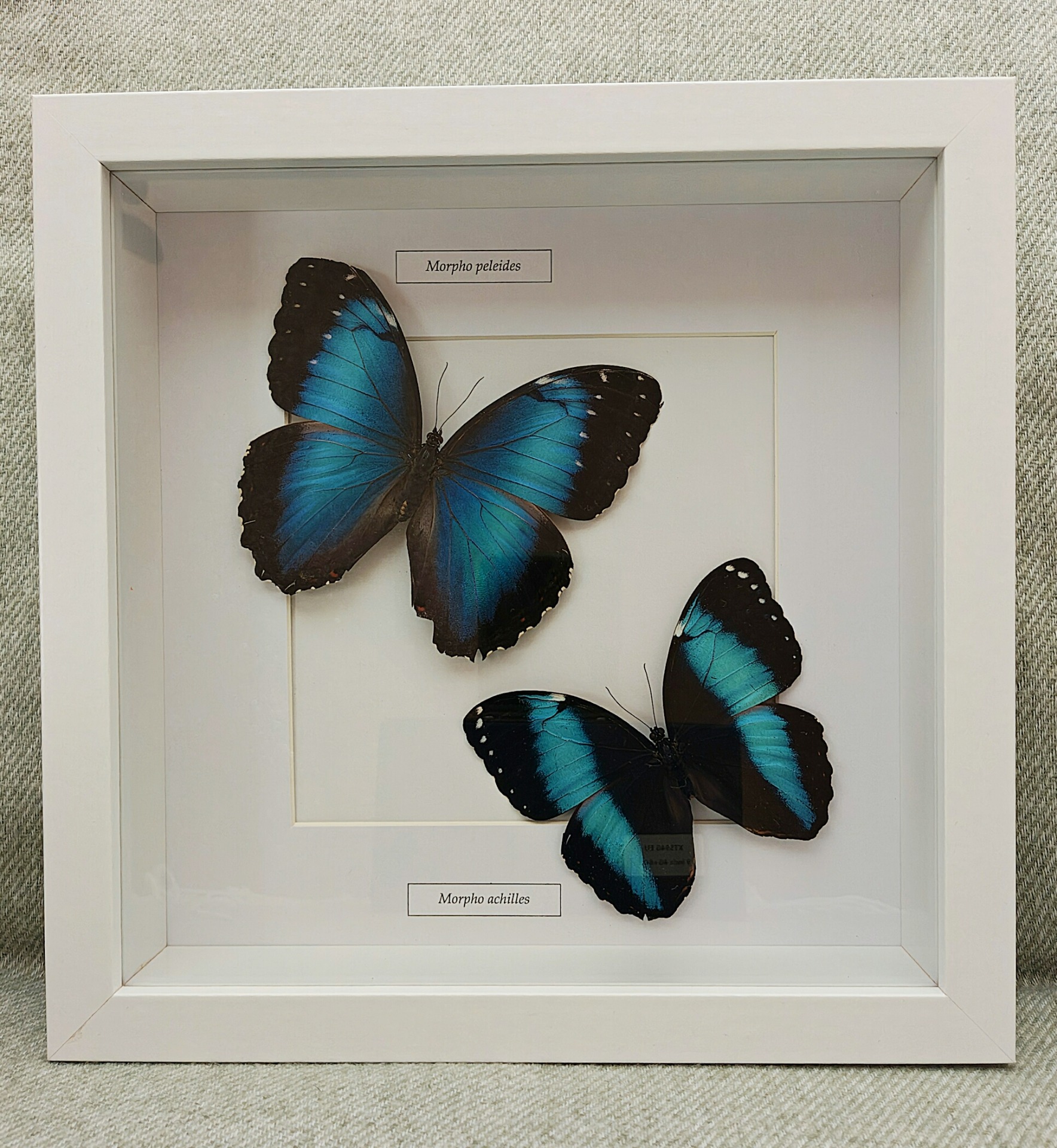 Ez a kompozíció két ikonikus Morpho fajt egyesít: a Morpho peleides és a Morpho achilles lepkéket, amelyek élénk, fémesen csillogó kék színükről híresek.