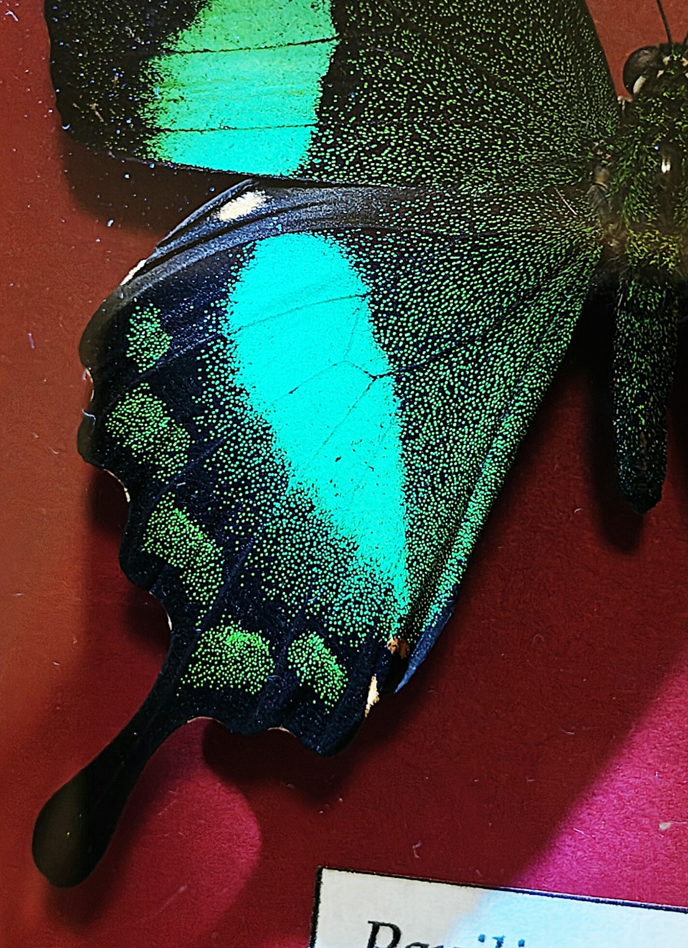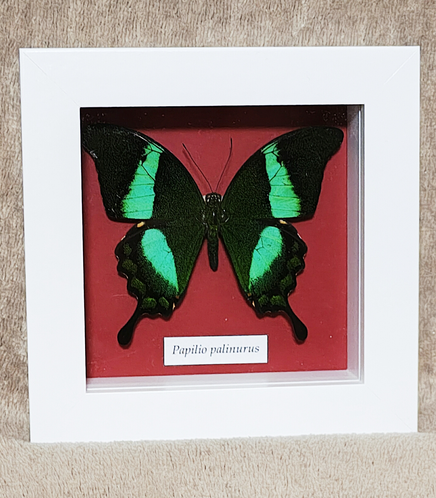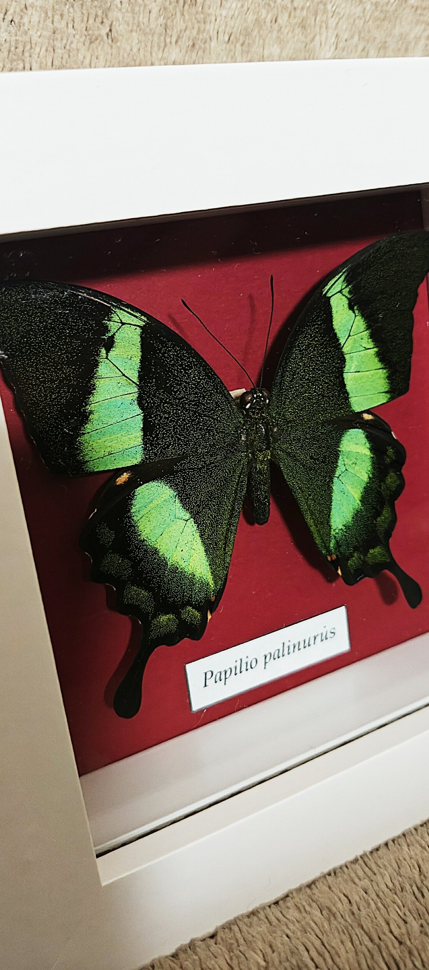 A különleges megjelenésű lepke mély, bársonyos feketéjét élénken világító, smaragdzöld szárnyfoltok törik meg. A Papilio palinurus színe különleges fénytörésének köszönhetően más-más szögből nézve szinte világít – igazi optikai élmény, amely élőben még hatásosabb, mint fotón.